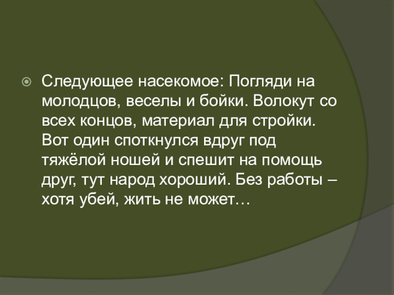 Слайд 7Следующее насекомое: Погляди на молодцов, веселы и бойки. Волокут со всех