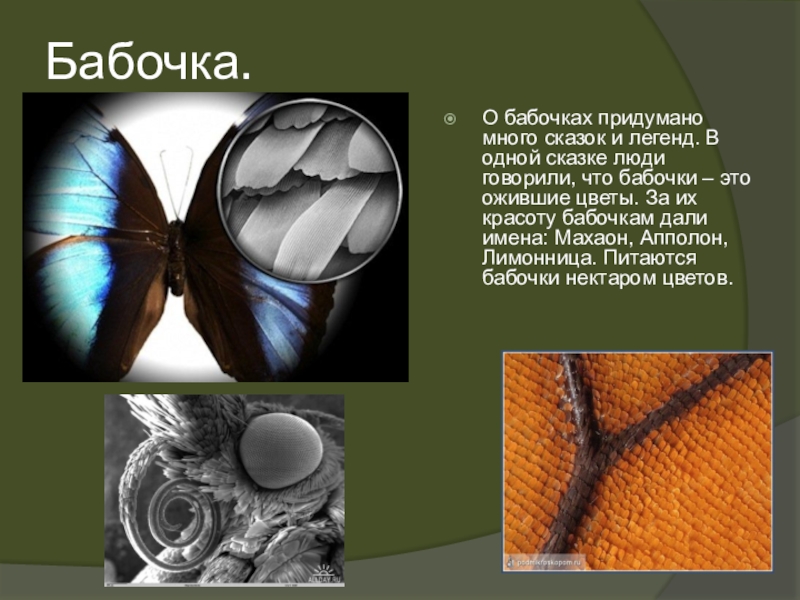 говорили, что бабочки – это ожившие цветы. За их красоту бабочкам дали имена: Махаон, Апполон, Лимонница. Питаются бабочки нектаром цветов.