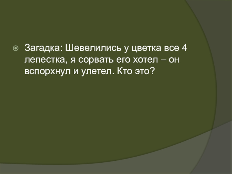 Слайд 9Загадка: Шевелились у цветка все 4 лепестка, я сорвать его хотел