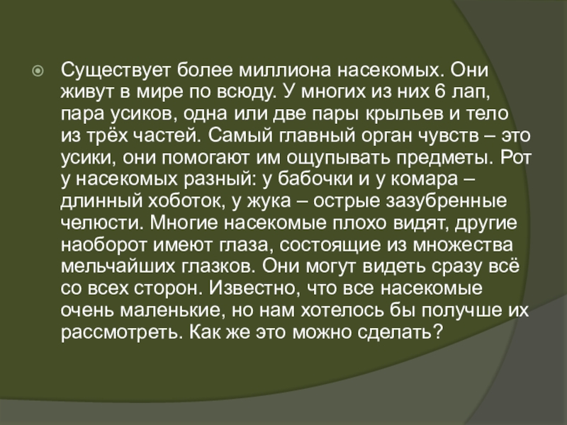 многих из них 6 лап, пара усиков, одна или две пары крыльев и тело из трёх частей. Самый главный орган чувств – это усики, они помогают им ощупывать предметы. Рот у насекомых разный: у бабочки и у комара – длинный хоботок, у жука – острые зазубренные челюсти. Многие насекомые плохо видят, другие наоборот имеют глаза, состоящие из множества мельчайших глазков. Они могут видеть сразу всё со всех сторон. Известно, что все насекомые очень маленькие, но нам хотелось бы получше их рассмотреть. Как же это можно сделать?