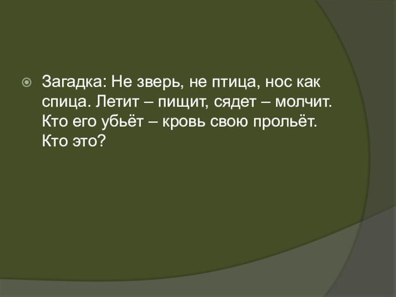 Слайд 11Загадка: Не зверь, не птица, нос как спица. Летит – пищит,