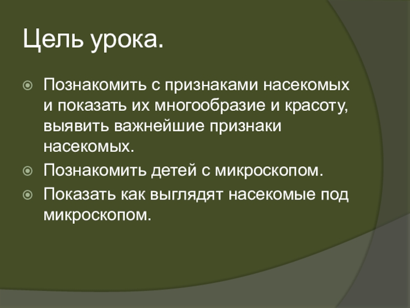 Познакомить с признаками насекомых и показать их многообразие и красоту,