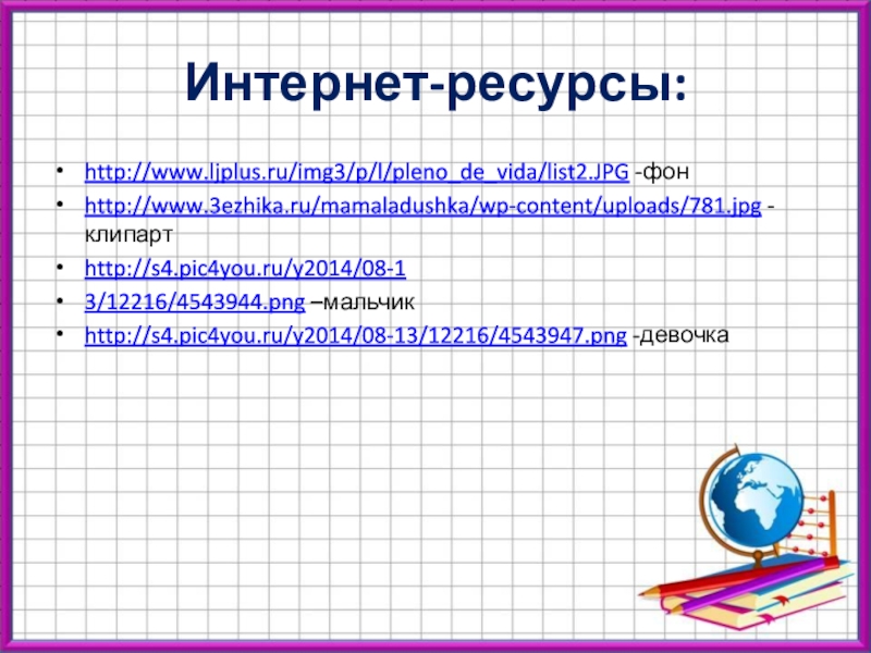 Интернет-ресурсы:http://www.ljplus.ru/img3/p/l/pleno_de_vida/list2.JPG -фонhttp://www.3ezhika.ru/mamaladushka/wp-content/uploads/781.jpg -клипартhttp://s4.pic4you.ru/y2014/08-13/12216/4543944.png –мальчикhttp://s4.pic4you.ru/y2014/08-13/12216/4543947.png -девочка