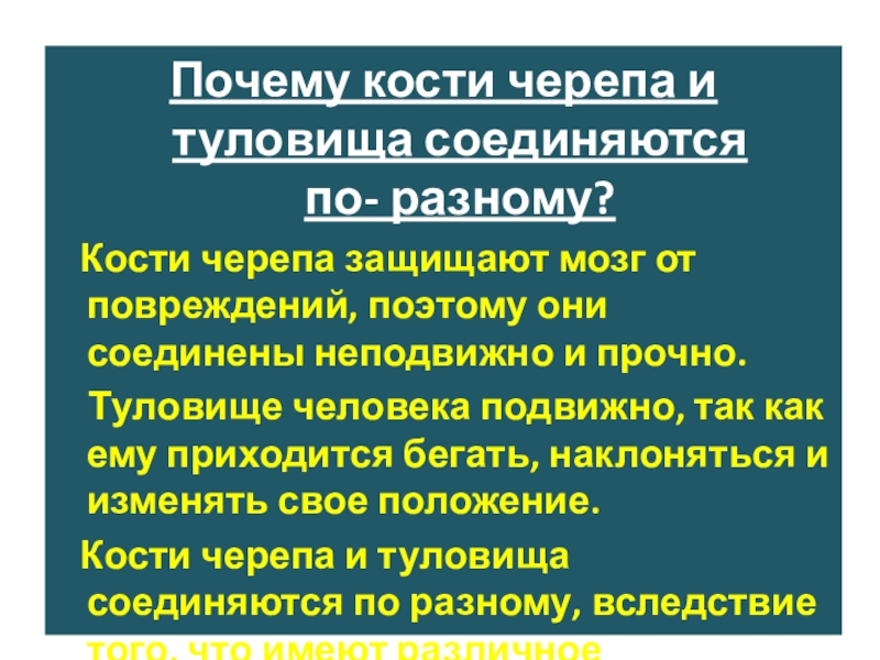 Почему кости черепа и туловища соединяются по- разному?  Кости черепа защищают мозг от повреждений, поэтому они соединены