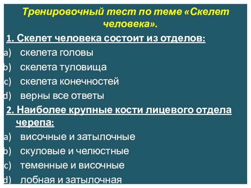 Тренировочный тест по теме «Скелет человека».1. Скелет человека состоит из отделов:скелета головыскелета туловищаскелета конечностейверны все ответы2. Наиболее
