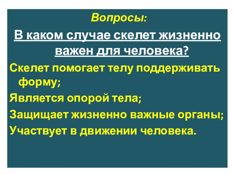 Вопросы:В каком случае скелет жизненно важен для человека?Скелет помогает телу поддерживать форму;Является опорой тела;Защищает жизненно важные органы;Участвует