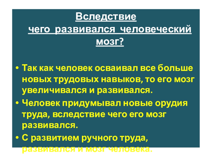 Вследствие чего  развивался  человеческий мозг?Так как человек осваивал все больше новых трудовых навыков, то его мозг увеличивался и развивался.Человек