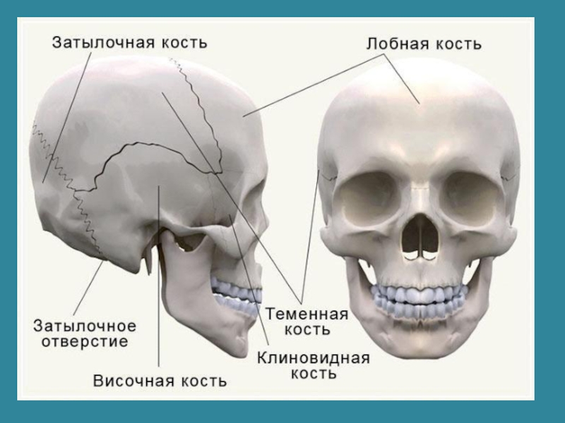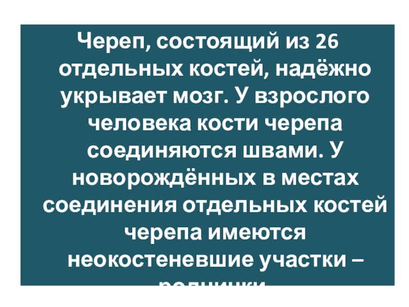Череп, состоящий из 26 отдельных костей, надёжно укрывает мозг. У взрослого человека кости черепа соединяются швами. У