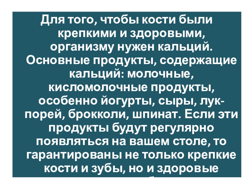 Слайд 12Для того, чтобы кости были крепкими и здоровыми, организму нужен кальций.