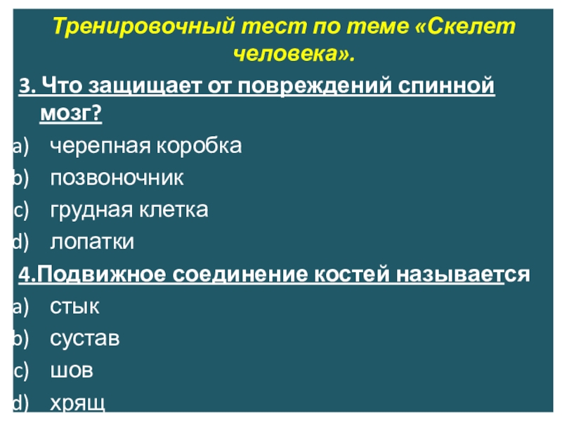 Тренировочный тест по теме «Скелет человека».3. Что защищает от повреждений спинной мозг?черепная коробкапозвоночникгрудная клеткалопатки4.Подвижное соединение костей называетсястыксуставшовхрящ