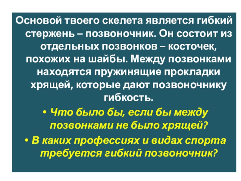 Основой твоего скелета является гибкий стержень – позвоночник. Он состоит из отдельных позвонков – косточек, похожих на