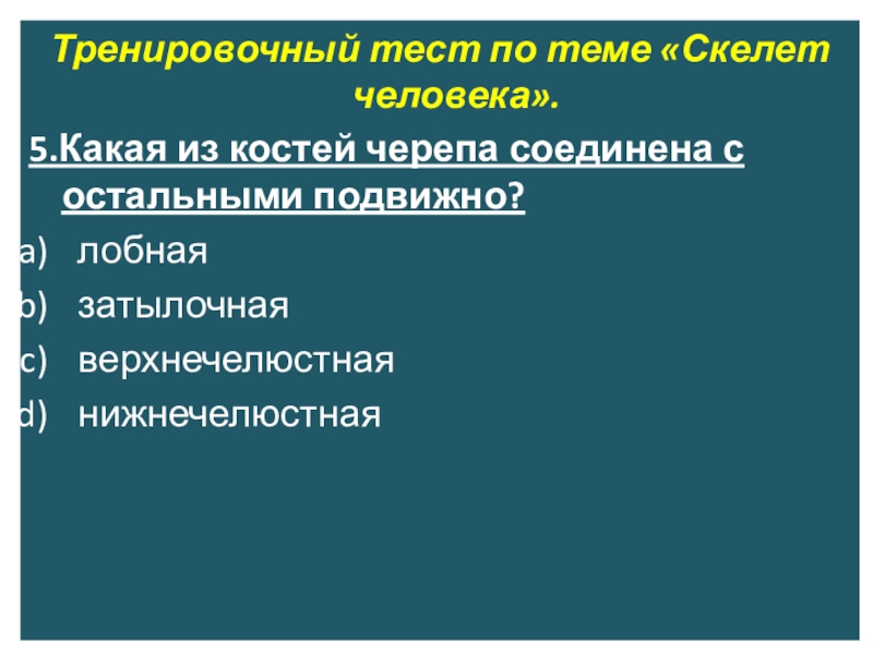 Тренировочный тест по теме «Скелет человека».5.Какая из костей черепа соединена с остальными по­движно?лобнаязатылочнаяверхнечелюстнаянижнечелюстная