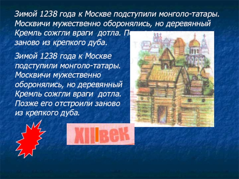 Зимой 1238 года к Москве подступили монголо-татары. Москвичи мужественно оборонялись, но деревянный Кремль сожгли враги дотла. Позже его отстроили заново из крепкого дуба.