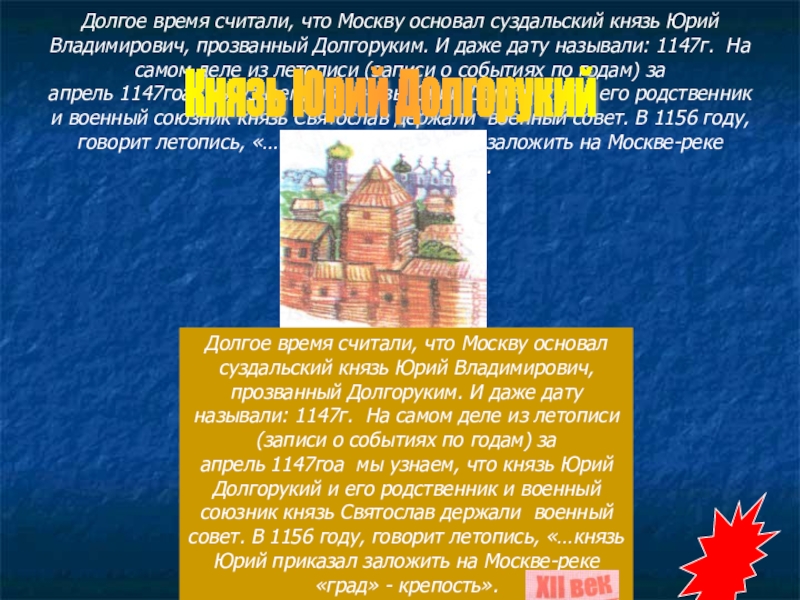 апрель 1147гоа мы узнаем, что князь Юрий Долгорукий и его родственник и военный союзник князь Святослав держали военный совет. В 1156 году, говорит летопись, «…князь Юрий приказал заложить на Москве-реке «град» - крепость».
