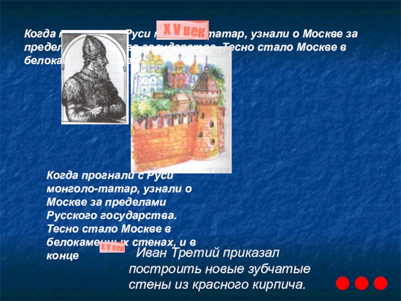 Когда прогнали с Руси монголо-татар, узнали о Москве за пределами Русского государства. Тесно стало Москве в белокаменных стенах, и в конце