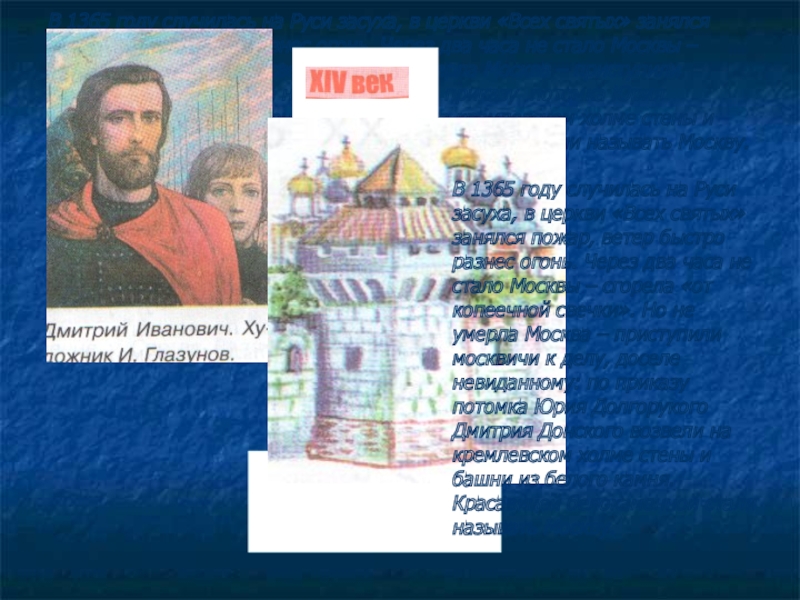 В 1365 году случилась на Руси засуха, в церкви «Всех святых» занялся пожар, ветер быстро разнес огонь. Через два часа не стало Москвы – сгорела «от копеечной свечки». Но не умерла Москва – приступили москвичи к делу, доселе невиданному: по приказу потомка Юрия Долгорукого Дмитрия Донского возвели на кремлевском холме стены и башни из белого камня. Красавицей белокаменной стали называть Москву.