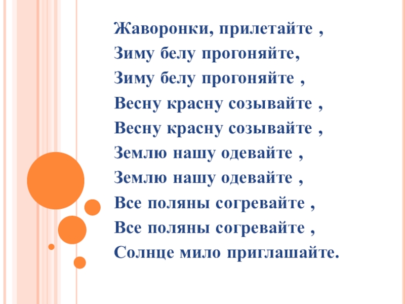 Жаворонки, прилетайте ,Зиму белу прогоняйте,Зиму белу прогоняйте ,Весну красну созывайте ,Весну красну созывайте ,Землю нашу одевайте ,Землю
