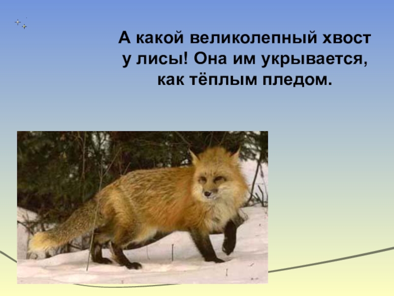 Слайд 4А какой великолепный хвост у лисы! Она им укрывается, как тёплым