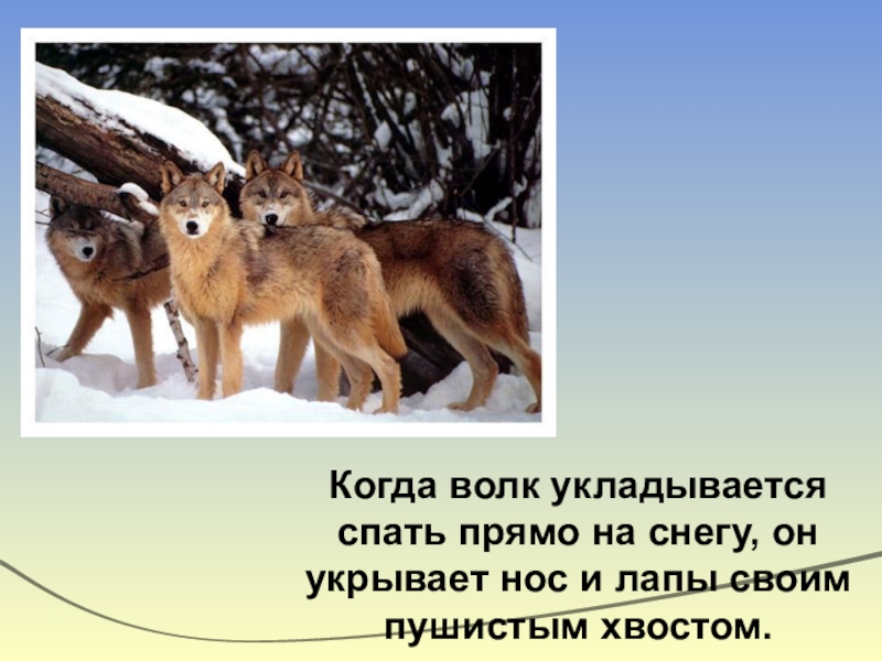 Слайд 3Когда волк укладывается спать прямо на снегу, он укрывает нос и