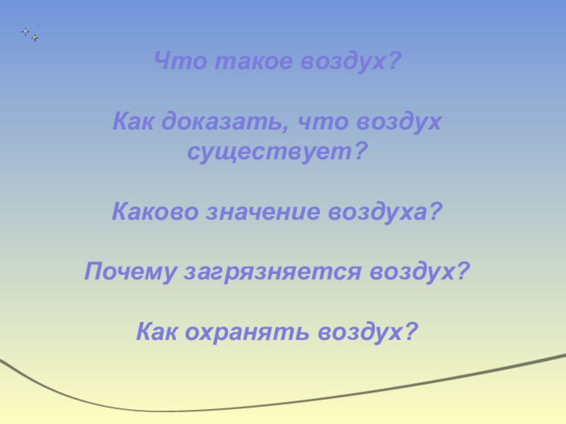 Что такое воздух?Как доказать, что воздух существует?Каково значение воздуха?Почему загрязняется воздух?Как охранять воздух?