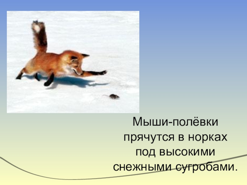 Слайд 5Мыши-полёвки прячутся в норках под высокими снежными сугробами.