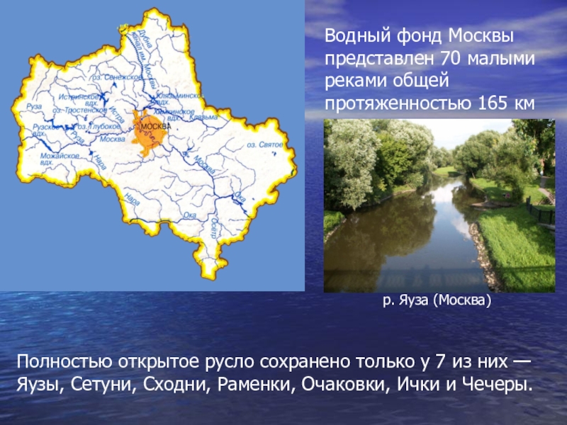 Полностью открытое русло сохранено только у 7 из них — Яузы, Сетуни, Сходни, Раменки, Очаковки, Ички и Чечеры.
