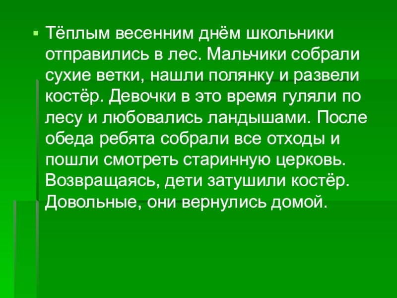 Тёплым весенним днём школьники отправились в лес. Мальчики собрали сухие ветки, нашли полянку и развели костёр. Девочки