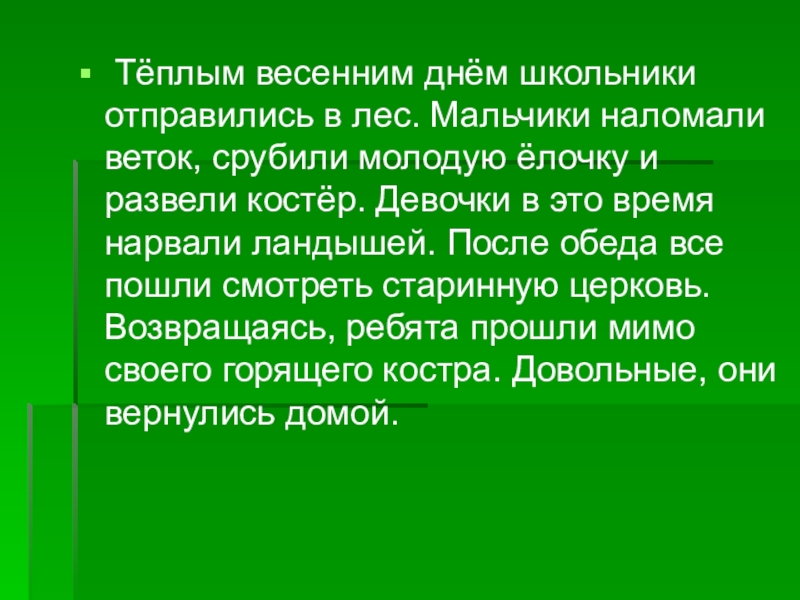 Слайд 10 Тёплым весенним днём школьники отправились в лес. Мальчики наломали веток,