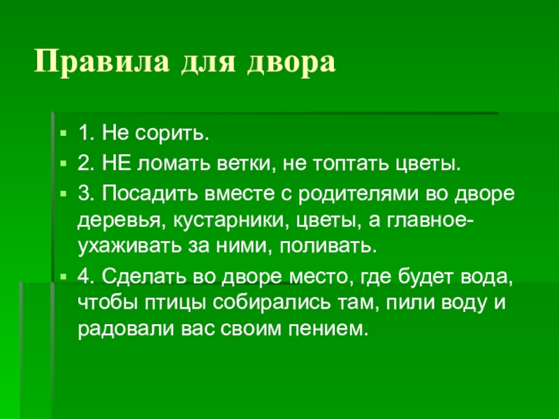 Правила для двора1. Не сорить.2. НЕ ломать ветки, не топтать цветы.3. Посадить вместе с родителями во дворе деревья, кустарники, цветы, а главное- ухаживать за ними, поливать.4. Сделать во дворе место, где будет вода, чтобы птицы собирались