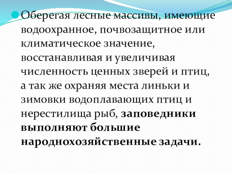увеличивая численность ценных зверей и птиц, а так же охраняя места линьки и зимовки водоплавающих птиц и нерестилища рыб, заповедники выполняют большие народнохозяйственные задачи.