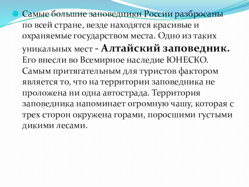 и охраняемые государством места. Одно из таких уникальных мест - Алтайский заповедник. Его внесли во Всемирное наследие ЮНЕСКО. Самым притягательным для туристов фактором является то, что на территории заповедника не проложена ни одна автострада. Территория заповедника напоминает огромную чашу, которая с трех сторон окружена горами, поросшими густыми дикими лесами.