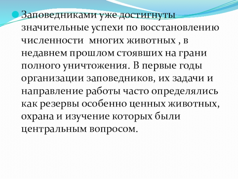 в недавнем прошлом стоявших на грани полного уничтожения. В первые годы организации заповедников, их задачи и направление работы часто определялись как резервы особенно ценных животных, охрана и изучение которых были центральным вопросом.