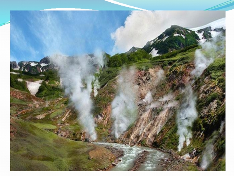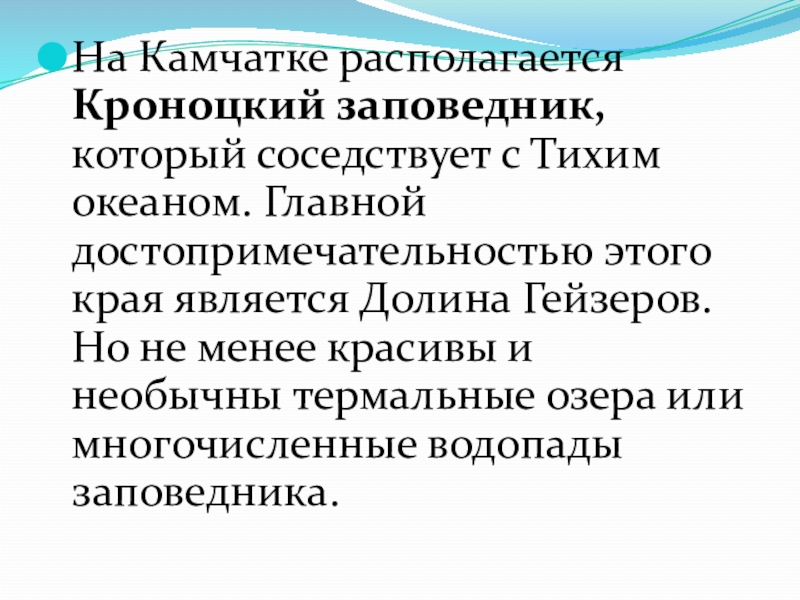 Слайд 24На Камчатке располагается Кроноцкий заповедник, который соседствует с Тихим океаном. Главной