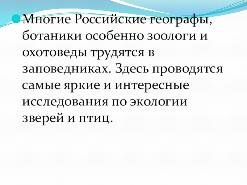 Слайд 4Многие Российские географы, ботаники особенно зоологи и охотоведы трудятся в заповедниках.
