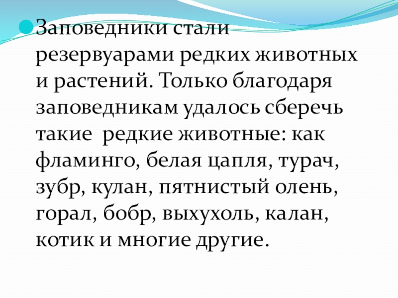 Слайд 6Заповедники стали резервуарами редких животных и растений. Только благодаря заповедникам удалось