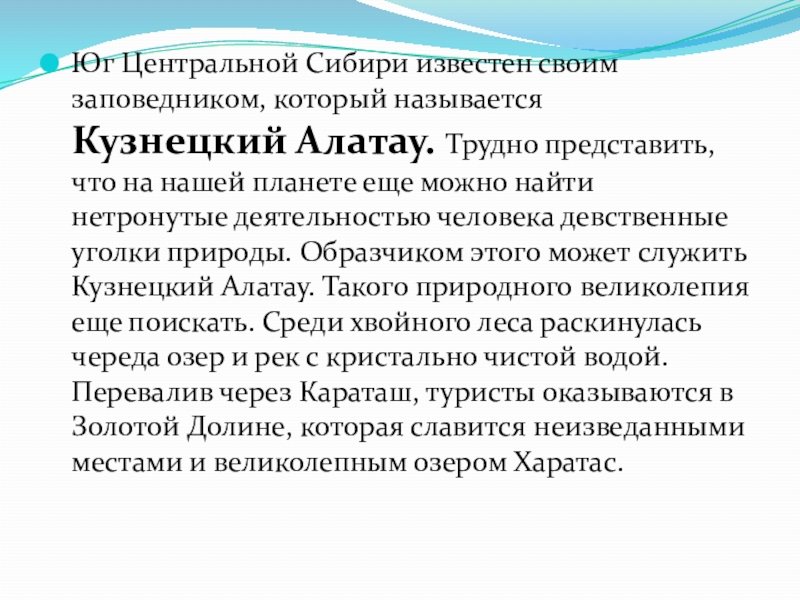 Слайд 22Юг Центральной Сибири известен своим заповедником, который называется Кузнецкий Алатау. Трудно