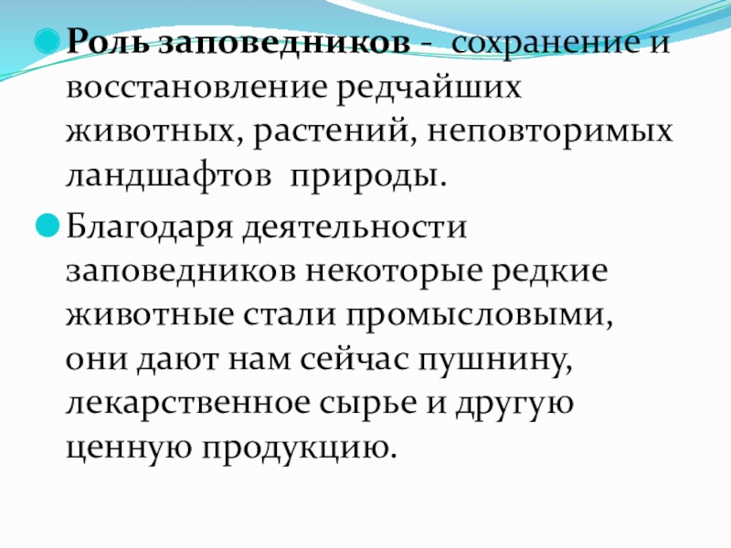 Благодаря деятельности заповедников некоторые редкие животные стали промысловыми, они дают нам сейчас пушнину, лекарственное сырье и другую ценную продукцию.
