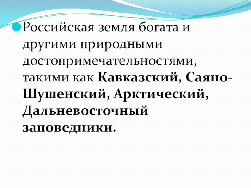 Слайд 26Российская земля богата и другими природными достопримечательностями, такими как Кавказский, Саяно-Шушенский,
