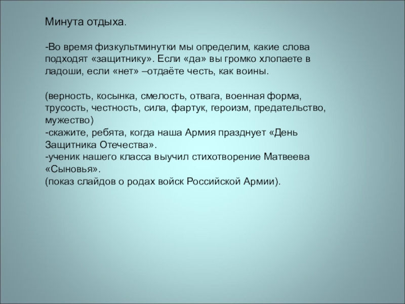 раскрыть духовно- нравственные перспективы через формирование представлений детей о защитниках Отечества, переживание чувства патриотизма и любви к Родине.