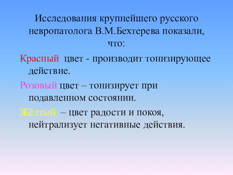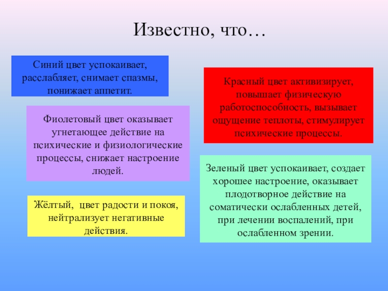 Красный цвет активизирует, повышает физическую работоспособность, вызывает ощущение теплоты, стимулирует психические процессы.