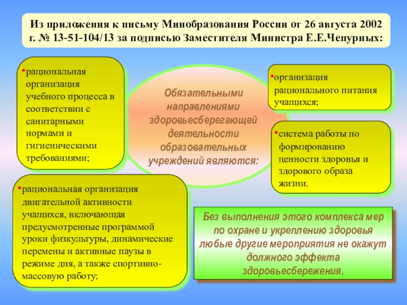 Без выполнения этого комплекса мер по охране и укреплению здоровья любые другие мероприятия не окажут должного эффекта здоровьесбережения.