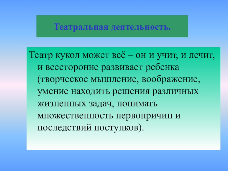 Зеленый цвет успокаивает, создает хорошее настроение, оказывает плодотворное действие на соматически ослабленных детей, при лечении воспалений, при ослабленном зрении.