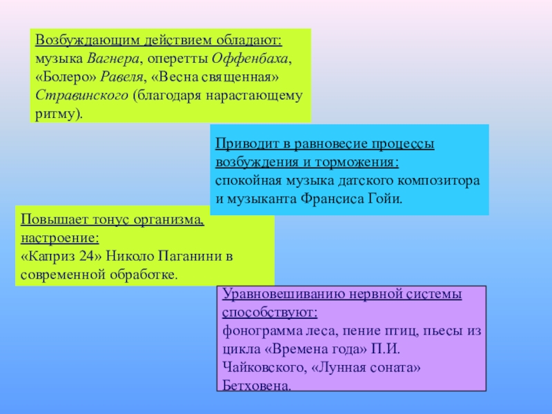 музыка Вагнера, оперетты Оффенбаха, «Болеро» Равеля, «Весна священная» Стравинского (благодаря нарастающему ритму).