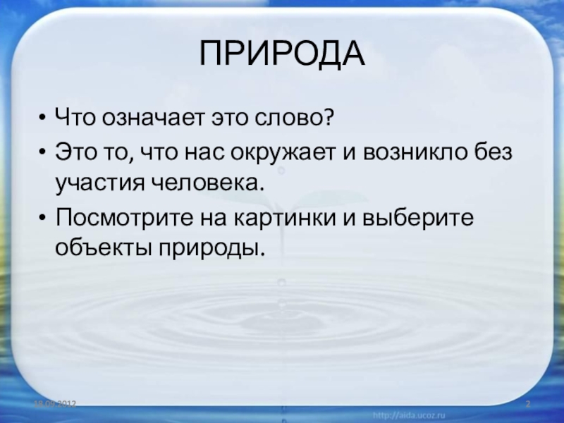 ПРИРОДАЧто означает это слово?Это то, что нас окружает и возникло без участия человека.Посмотрите на картинки и выберите