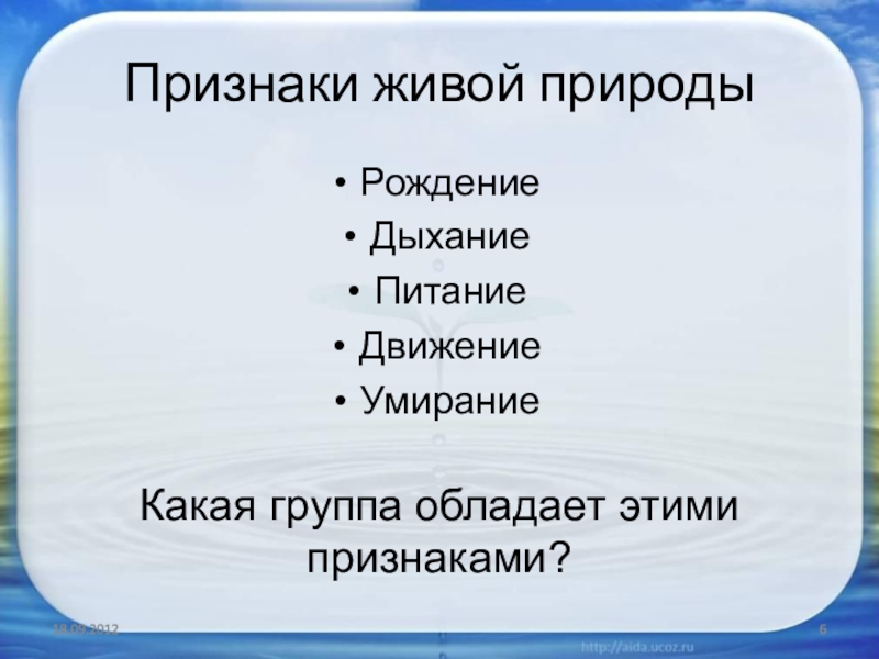 Признаки живой природыРождениеДыханиеПитаниеДвижениеУмирание Какая группа обладает этими признаками?