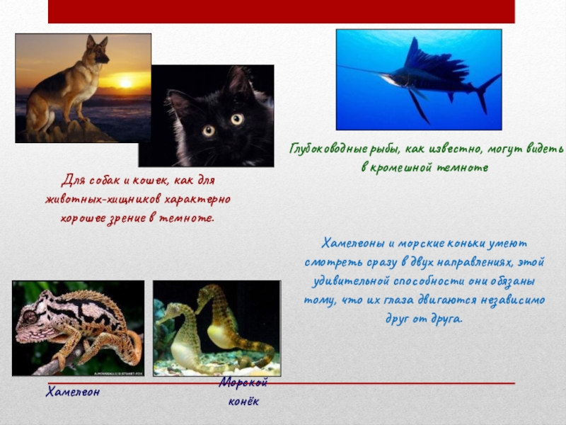 Хамелеоны и морские коньки умеют смотреть сразу в двух направлениях, этой удивительной способности они обязаны тому, что их глаза двигаются независимо друг от друга.