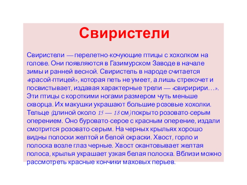 Газимурском Заводе в начале зимы и ранней весной. Свиристель в народе считается «красой-птицей», которая петь не умеет, а лишь стрекочет и посвистывает, издавая характерные трели — «свиририри…». Эти птицы с короткими ногами размером чуть меньше скворца. Их макушки украшают большие розовые хохолки. Тельце (длиной около 15 — 18 см) покрыто розовато-серым оперением. Оно буровато-серое с красным оперение, издали смотрится розовато-серым. На черных крыльях хорошо видны полоски желтой и белой окраски. Хвост, горло и полоска возле глаз черные. Хвост окантовывает желтая полоса, крылья украшает узкая белая полоска. Вблизи можно рассмотреть красные кончики маховых перьев.