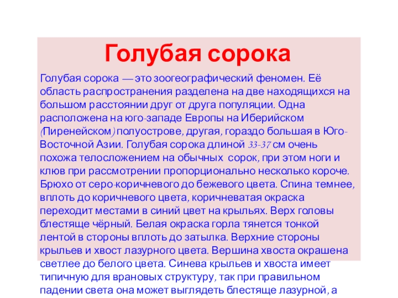 Голубая сорока — это зоогеографический феномен. Её область распространения разделена на