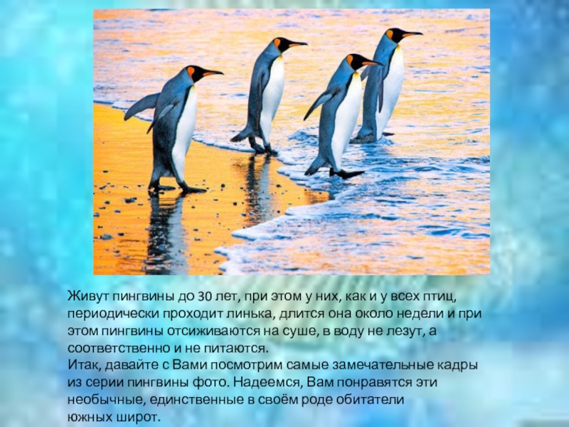 Слайд 5Живут пингвины до 30 лет, при этом у них, как и