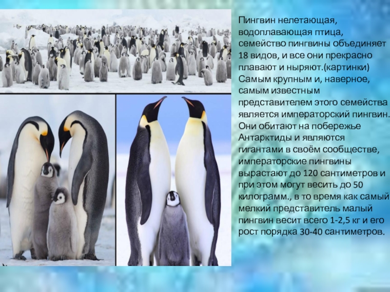 они прекрасно плавают и ныряют.(картинки) Самым крупным и, наверное, самым известным представителем этого семейства является императорский пингвин. Они обитают на побережье Антарктиды и являются гигантами в своём сообществе, императорские пингвины вырастают до 120 сантиметров и при этом могут весить до 50 килограмм., в то время как самый мелкий представитель малый пингвин весит всего 1-2,5 кг и его рост порядка 30-40 сантиметров.